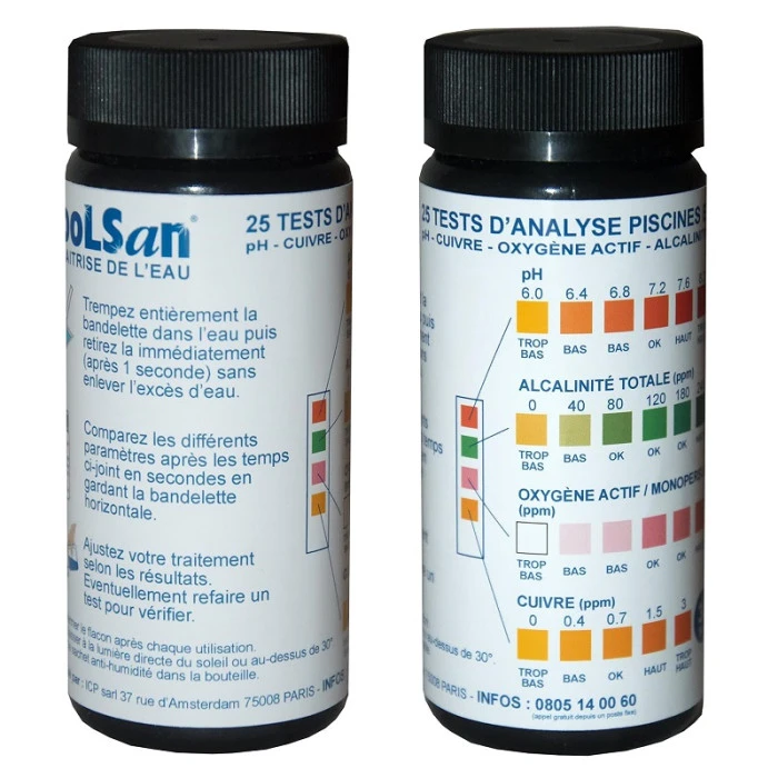 - 1 étui de 25 bandelettes tests pH / Alcalinité / Oxygène Actif / Cuivre ;